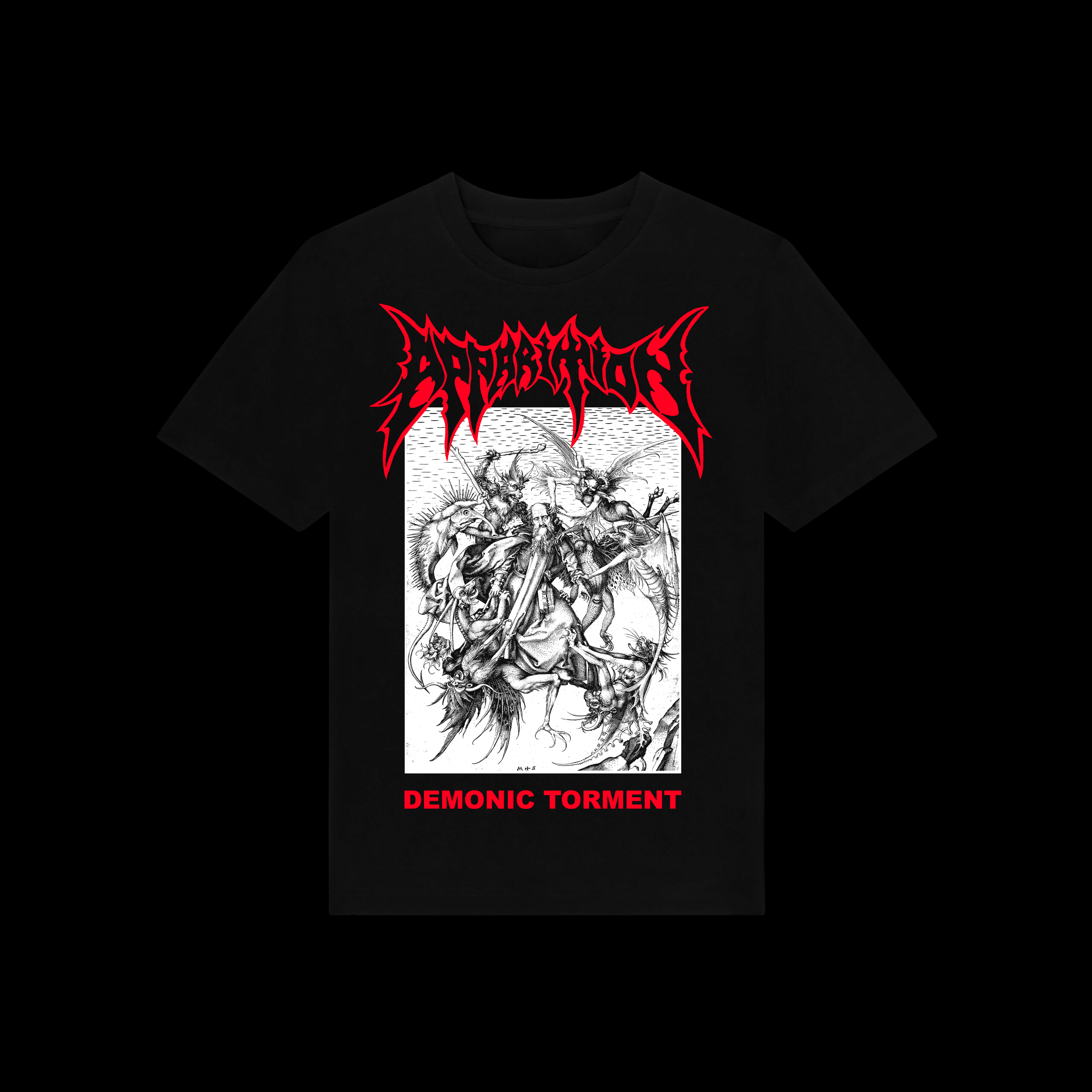 Gildan Heavy Cotton black t-shirt silkscreened in red and white, front and back. Based on the Apparition song “Demonic Torment”, first released on the self-titled demo, then re-recorded for the band’s debut album, Fear the Apparition. Since the song itself was partly inspired by the torment of Saint Anthony, the artwork for the t-shirt was taken from the 1470s engraving The Temptation of St. Anthony, by Martin Schongauer, which was also included in the layout of the Apparition demo. Printing done by @simbiosiscollection. Available in different sizes.