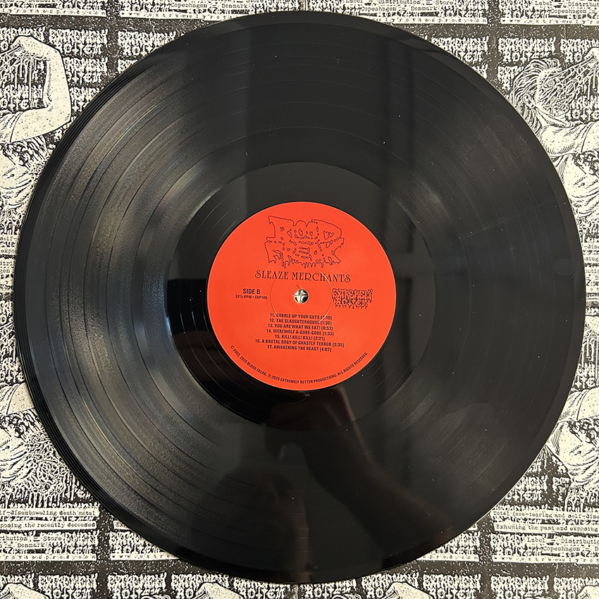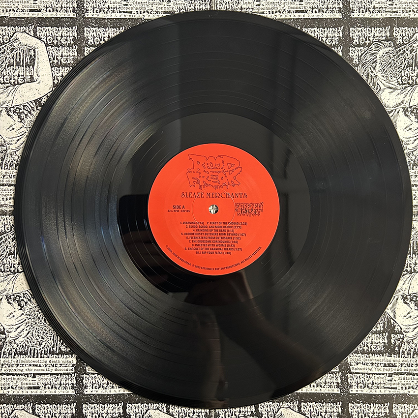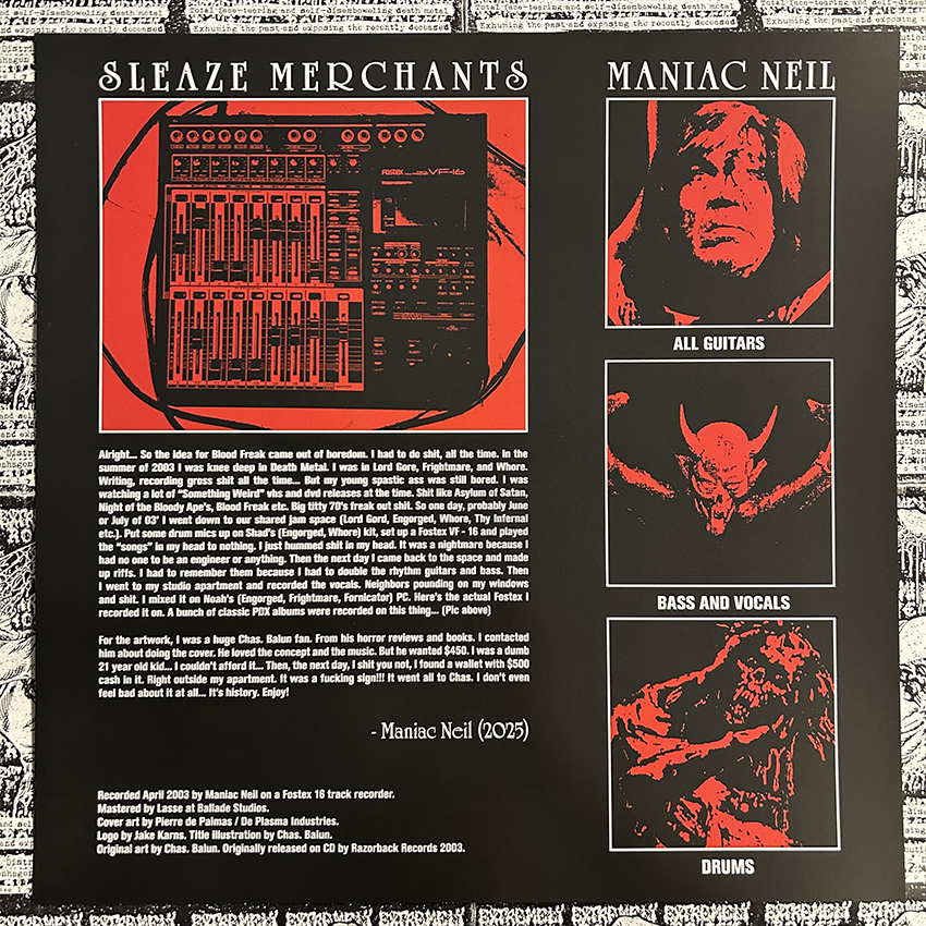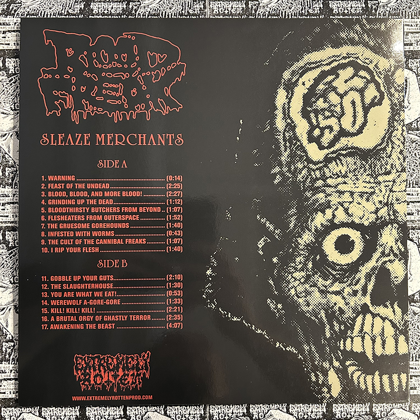 Influenced by classic horror and 90s acts such as Impetigo, Blood Freak were one of the flagship bands of the golden years of Razorback Recordings. Sleaze Merchants is their debut album, originally released in 2003 and now available on vinyl for the first time, thanks to Extremely Rotten Productions. The original artwork by gore legend Chas Balun was unfortunately lost in a house fire, so the label has comissioned a reimagined artwork by Pierre de Palmas, based on the original cover. It also includes liner notes by Maniac Neil (Blood Freak) and Billy Nocera (Razorback Recordings).